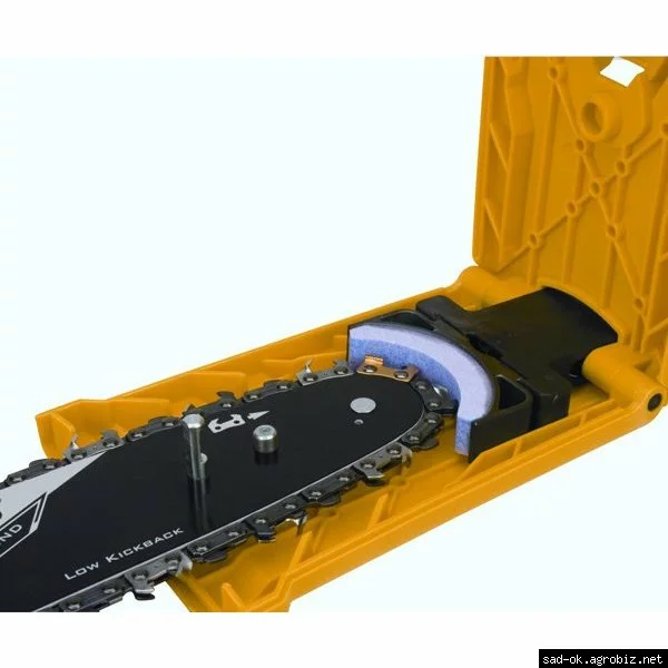 Когда цепь бензопилы затупилась, установите заточное устройство на шину PowerSharp и закрепите его, установив стальные шпильки на направляющих отверстиях. Затем закройте крышку.