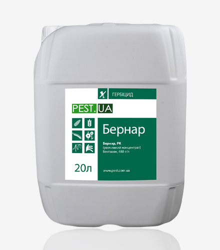 Назва товару: Бернар Короткий опис: Бернар — післясходовий селективний гербіцид контактної дії для боротьби з однорічними дводольними бур’янами, в т.ч. осоковими, в посівах сої. Механізм дії: Дієва речовина бентазон блокує фотосинтетичний транспорт електронів у хлоропластах, що призводить до припинення асиміляції вуглецю та загибелі бур'янів. Поглинається листям і корінням рослин. Переміщується акропетально по рослині, викликаючи системний вплив. Переваги: - Високоселективний до сої. - Контролює широкий спектр дводольних бур’янів. - Зручний у застосуванні. - Не має обмежень у сівозміні. Особливості застосування: - Обприскування посівів сої у фазі 1-3 справжніх листків. - Максимальна норма витрати застосовується при розвинутих бур’янах. - Можливе використання в бакових сумішах з іншими препаратами. - Не рекомендується змішувати з протизлаковими гербіцидами на основі клетодиму.