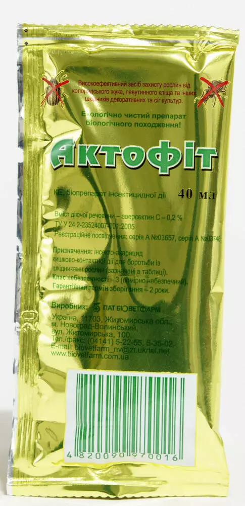 Діюча речовина: Препарат Актофіт виготовлений на основі комплексу природних авермектинів (аверсектин С 0,2%), що продукуються грунтовим грибом Streptomyces avermitilis. Авермектини - це природні високоспецифічні нейротоксини, які в мікродозах, проникаючи в організм членистоногих шкідників кишковим або контактним шляхом, незворотно вражають їх нервову систему. Внаслідок чого у комахи настає параліч, а згодом смерть. Вже через 4-10 годин шкідники перестають харчуватись, на 2-3 добу гинуть.