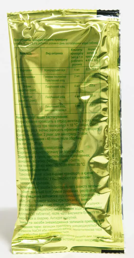Правила зберігання препарату: Препарат слід зберігати у спеціалізованих складських приміщеннях, що призначені для зберігання пестицидів, при температурі від -20°С до +30°С. Термін придатності 2 роки від дати виготовлення.