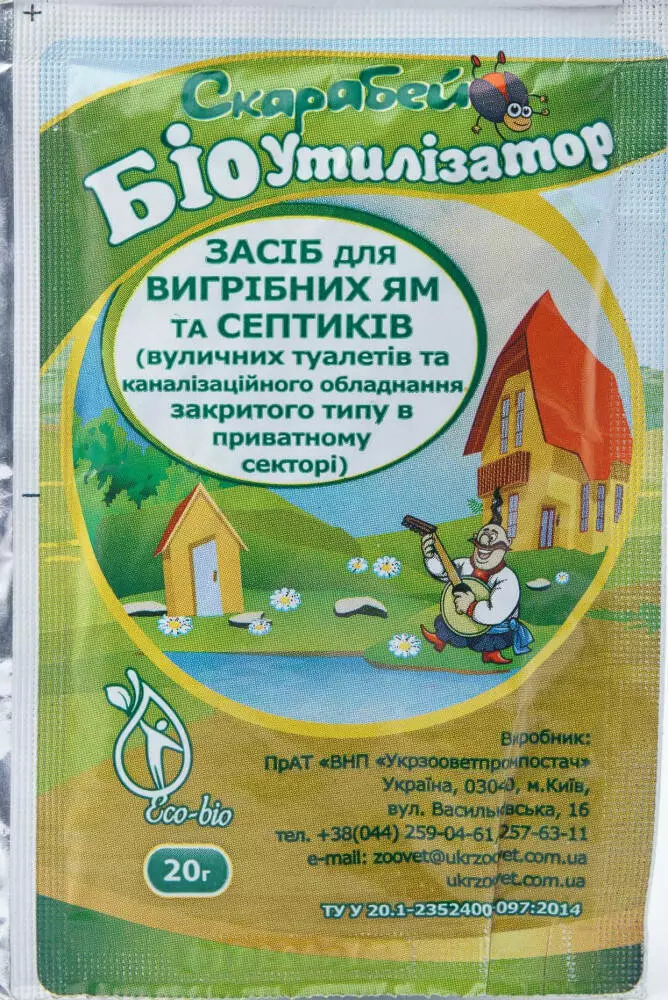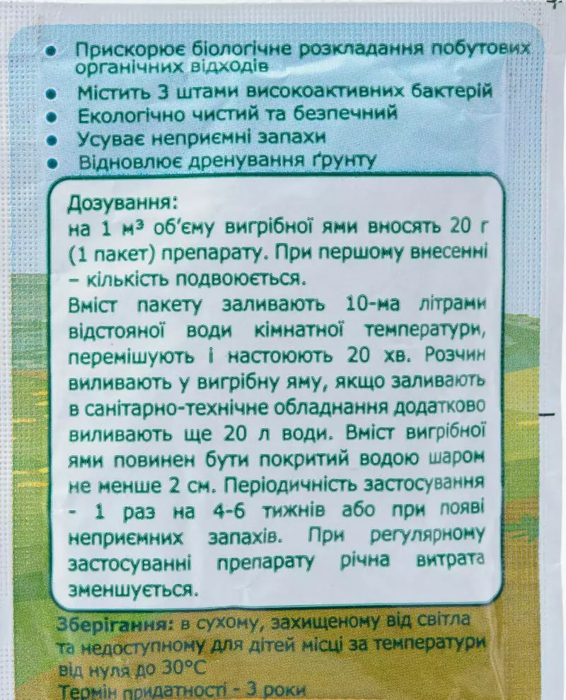 Для прискорення біологічного розкладання побутових органічних відходів, для очищення вигрібних ям, вуличних туалетів, септиків та каналізаційного обладнання закритого типу у приватному секторі.