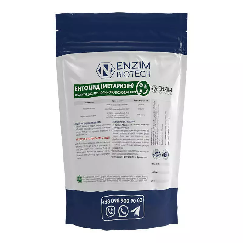 Ентоцид біологічний ґрунтовий інсектицид на основі міцелію та спор кількох рас ентомопатогенних грибів.