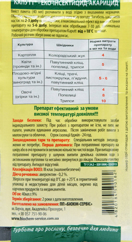 Капут – біоінсектоакарицид виготовлений на основі продуктів життєдіяльності грунтових грибів Streptomyces avermitilis