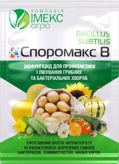 Біологічний фунгіцид Споромакс, В - 10г - для профілактики та лікування рослин та ґрунту від грибкових та бактерыальних хвороб. Біопрепарат діє як стимулятор росту для захищених культур.