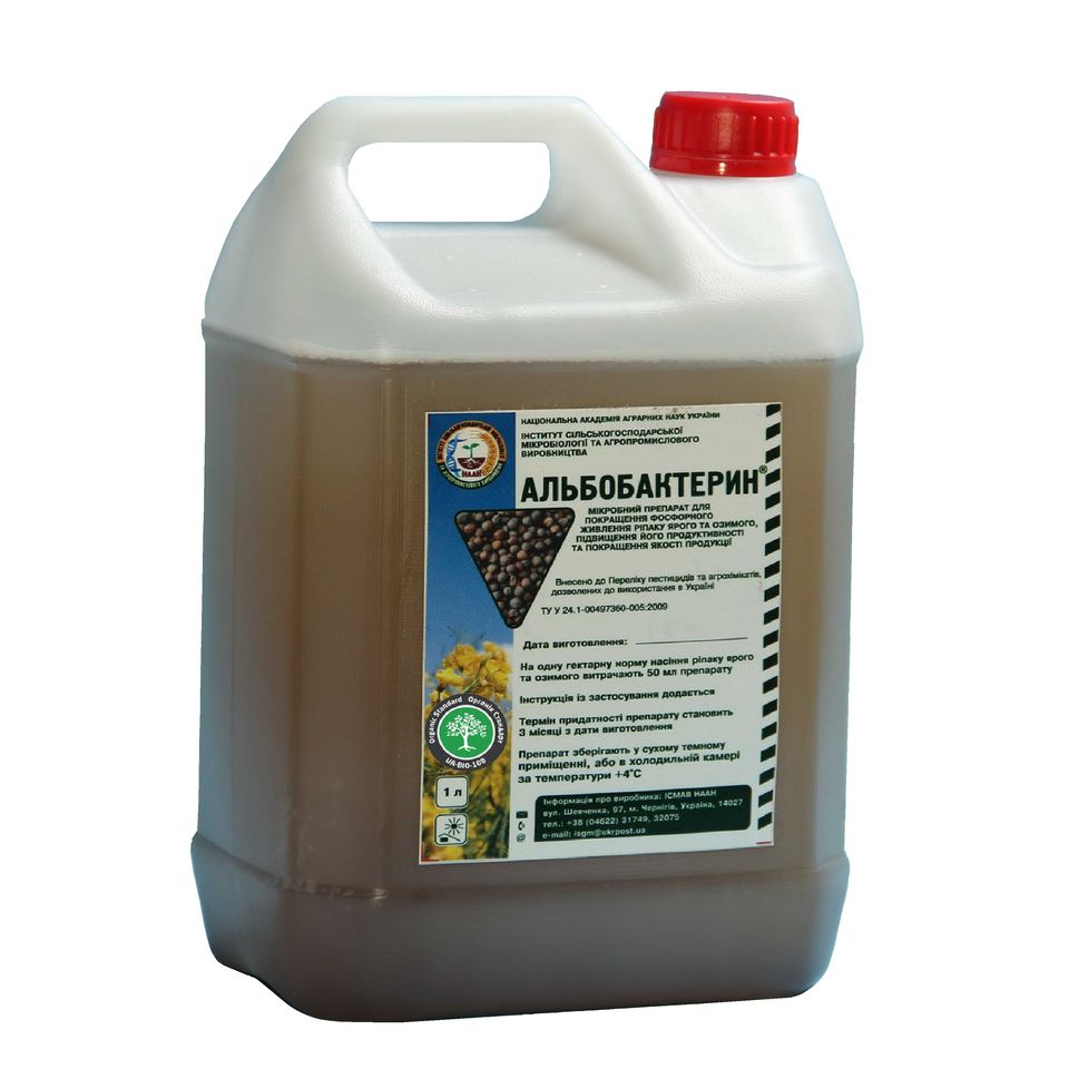 Діючою речовиною Альбобактерину є фосфатмобілізуюча бактерія Achromobacter album 1122, механізм дії пов’язаний з властивостями бактерій продукувати органічні кислоти, а також фермент фосфатазу, що сприяє розчинення важкорозчинних мінеральних і органічних фосфатів ґрунту і добрив, у результаті чого активізується процес засвоєння фосфору рослинами.