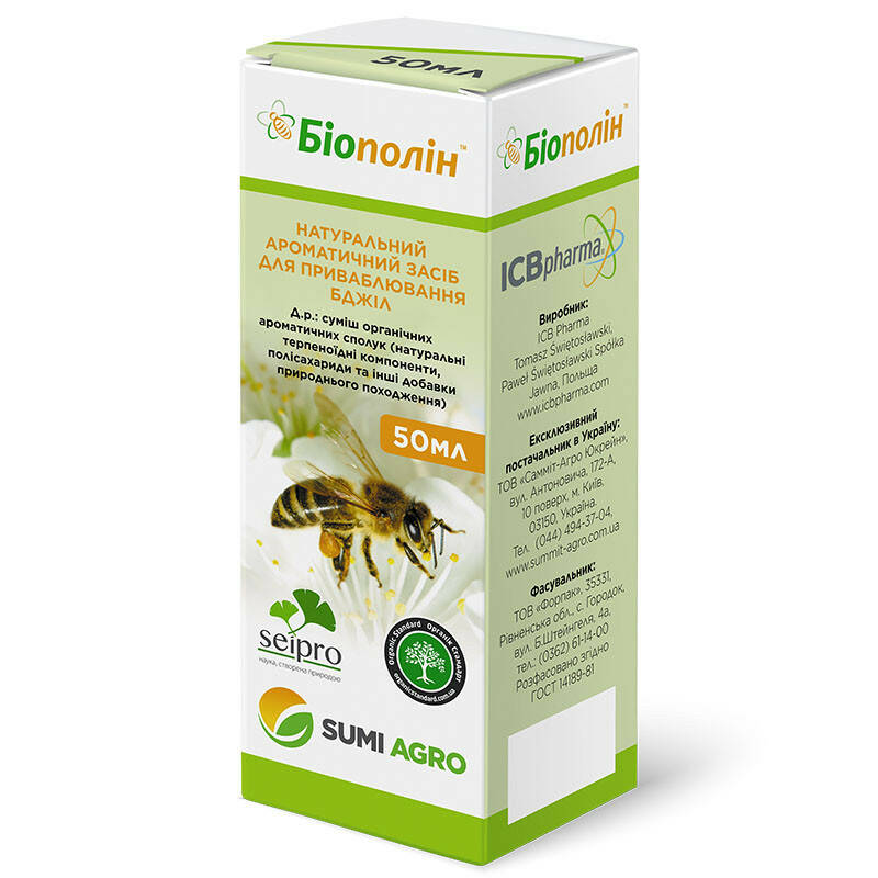 Механізм дії :  Натуральний ароматичний препарат Біополін призначений для обробки квітучих плодово-ягідних культур з метою залучення бджіл та інших комах-запилювачів. Препарат Біополін містить в основі натуральні компоненти природного походження: суміш органічних ароматичних сполук (натуральні терпеноїдні компоненти, полісахариди та інші добавки природного походження). Обробка препаратом Біополін робить рослини привабливішими для бджіл. Біополін виготовлений за унікальною технологією мікрокапсулювання (slow release technology), завдяки якій препарат рівномірно і довго випаровується, залучаючи комах-запилювачів протягом тривалого часу. В результаті добре запилені рослини утворюють більше якісних плодів, що важливо як для комерційного садівництва, так і для домашнього городництва. Препарати для залучення бджіл також можуть бути корисні для бджолярів. Вони можуть збільшити доступ бджіл до нектару та пилку, що підвищує продуктивність меду та інших бджолиних продуктів.