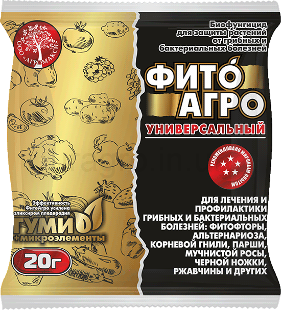 "ФитоАгро" - мікробіологічний препарат призначений для захисту городніх, садових, кімнатних і оранжерейних рослин від комплексу грибних і бактеріальних хвороб (фітофторозу, кореневої гнилі, парші, борошнистої роси, чорної ніжки, іржі, альтернаріозу, фузаріозу та ін) Крім захисної та профілактичної функції, володіє імуностимулюючим і антистресовими властивостями, посилює захисні функції рослин при несприятливих чинників довкілля (різкі перепади температур, заморозки, посуха та ін.) Немає терміну очікування (продукцію можна вживати в їжу в день обробки).