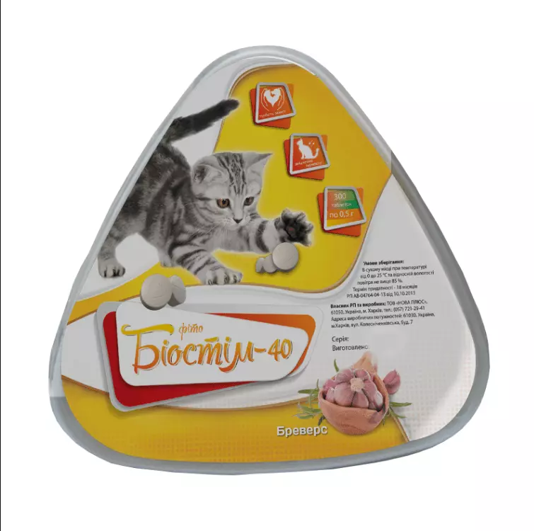 Щоденна кормова добавка для котів на основі пивних дріжджів "Біостім-40. Бреверс" містить повний спектр амінокислот, у т.ч.: метіонін, вітаміни групи В, жирні кислоти Омега-3, біотин, мікроелементи (цинк). Екстракт часнику, що входить до складу препарату, є прекрасним профілактичним засобом від гельмінтів.