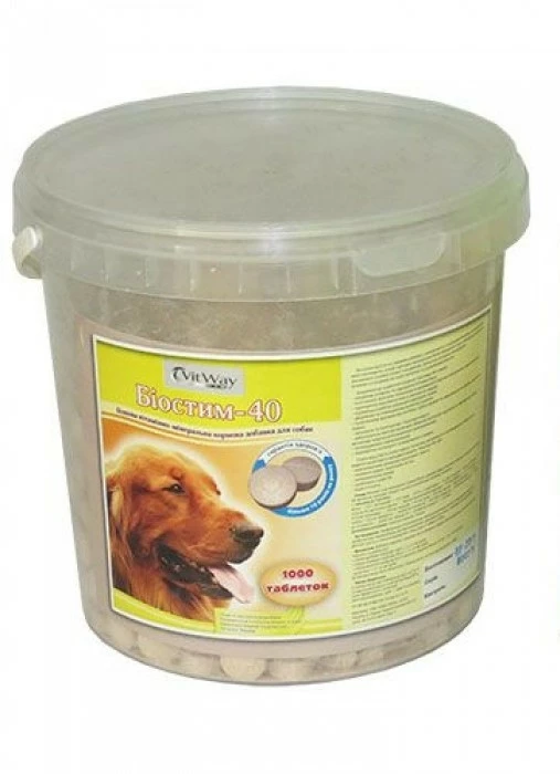Висококалорійний джерело білка, вітамінів і мінералів "Біостим - 40" розроблений Технологічним інститутом молока і м'яса Української Академії Аграрних наук. Цей препарат створювався як натуральний повноцінний білковий концентрат для собак з лікувально-профілактичним ефектом з натуральних харчових інгредієнтів. Саме наявність натуральних компонентів виділяє його серед безлічі подібних товарів і, протягом останніх 10 років, дозволяє лідирувати серед аналогічних білкових вітамінно-мінеральних добавок.