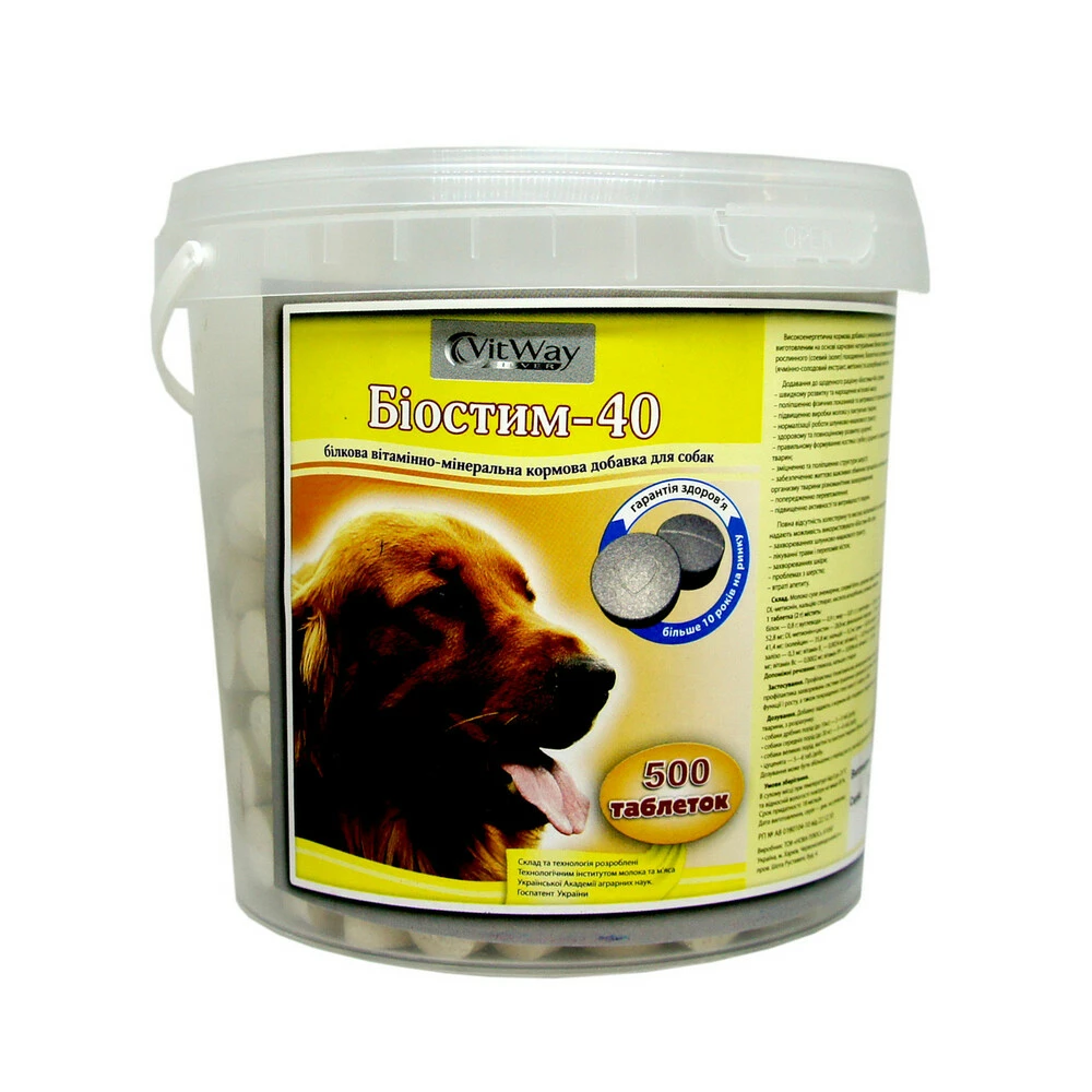 Висококалорійний джерело білка, вітамінів і мінералів "Біостим - 40" розроблений Технологічним інститутом молока і м'яса Української Академії Аграрних наук. Цей препарат створювався як натуральний повноцінний білковий концентрат для собак з лікувально-профілактичним ефектом з натуральних харчових інгредієнтів. Саме наявність натуральних компонентів виділяє його серед безлічі подібних товарів і, протягом останніх 10 років, дозволяє лідирувати серед аналогічних білкових вітамінно-мінеральних добавок.
