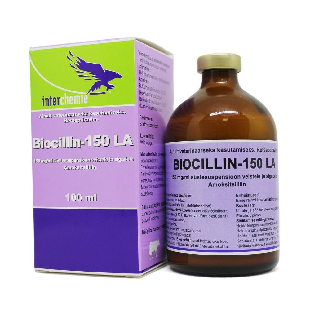 Біоцилін – 150 ЛА швидко поширюється по всьому організму, досягаючи високих концентрацій в м’язових тканинах, печінці, нирках, кишковому тракті. Утворює незначні з’єднання з плазматичними протеїнами (17-20%). Зберігає терапевтичну концентрацію в організмі 48-72 години. Ліки в невеликому ступені проникають в мозок і кісткову рідину, за винятком випадків, коли мозкова оболонка запалена. Амоксицилін стійкий до середовищ і в організмі практично не метаболізується. Препарат виводиться, в основному, з сечею, меншою мірою з молоком і жовчю.
