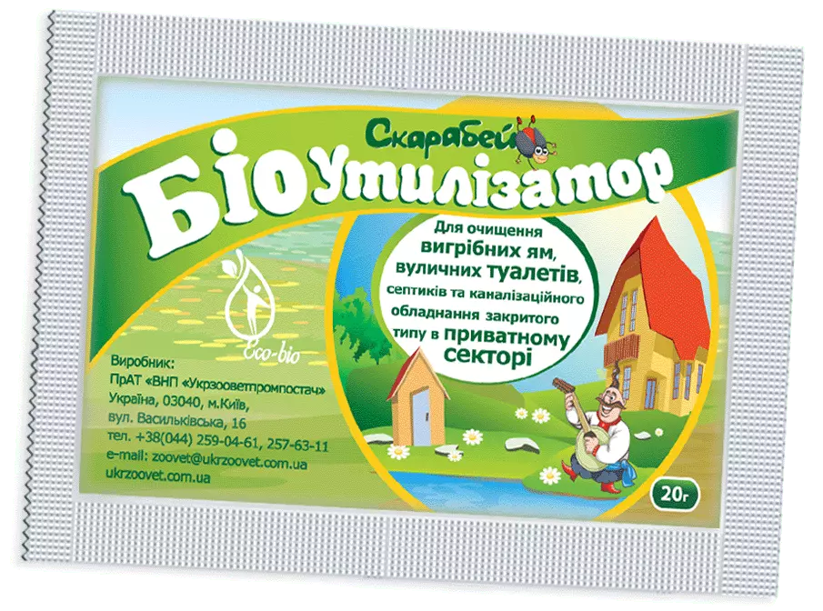 Біоутилізатор "Скарабей" - це високоефективна композиція адаптованих до специфічного середовища бактерій. Оптимально підібраний склад біопрепарату та висока ферментативна активність композиції бактерій дозволяють швидко утилізувати всі типи побутових органічних відходів. При внесенні до вигрібної ями мікроорганізми активно розкладають залишки, накопичені в результаті експлуатації. При цьому поступово зменшується вміст твердих фракцій (фекалій) та відновлюється дренаж ґрунту. Наявність миючих засобів, за винятком засобів хлору типу «БЕЛИЗНИ», не впливає на швидкість біологічного розкладання. Спорові культури, що входять до складу препарату, володіють також антагоністичною активністю до хвороботворної мікрофлори, що сприяє знезараженню органічних відходів.