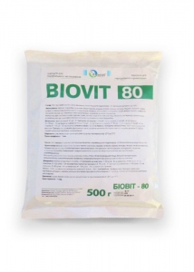 Біовіт-80 порошок для перорального застосування Склад 100 г препарату містить діючу речовину: хлортетрациклін гідрохлорид - 8 г. Допоміжні речовини: до 100 г. Застосування Телятам, поросятам, хутровим звірам (кролям, видрам, нутріям, норкам, лисицям, песцям): лікування тварин, хворих на пастерельоз, колібактеріоз, сальмонельоз, лістеріоз, лептоспіроз, септицемію, гастрит, ентерит, бронхіт, пневмонію, плевропневмонію, що спричинені мікроорганізмами, чутливими до хлортетрацикліну. Молодняку свійської птиці (курам, індикам, гусям, качкам): лікування свійської птиці, хворої на пастерельоз, сальмонельоз, колісептицемію, що спричинені мікроорганізмами чутливими до хлортетрацикліну. Дозування Телятам віком 5-10 діб - 5г препарату на тварину, 11-30 діб - 6г на тварину, 31-60 діб - 8г на тварину, 61-120 діб - 10г на тварину; поросятам віком 5-10 діб - 1г препарату на тварину, 11-30 діб - 2г на тварину, 31-60 діб - 4г на тварину, 61-120 діб - 10 г на тварину; хутровим звірам - 0,16г на тварину; молодняку свійської птиці - 0,63г препарату на 1кг маси тіла. Препарат застосовують груповим методом з кормом, молоком або водою один раз на добу протягом 5-7 діб до повного зникнення симптомів захворювання. Зберігання Сухе, темне, недоступне для дітей місце при температурі від -20°С до 35°С. Термін придатності - 1 рік.