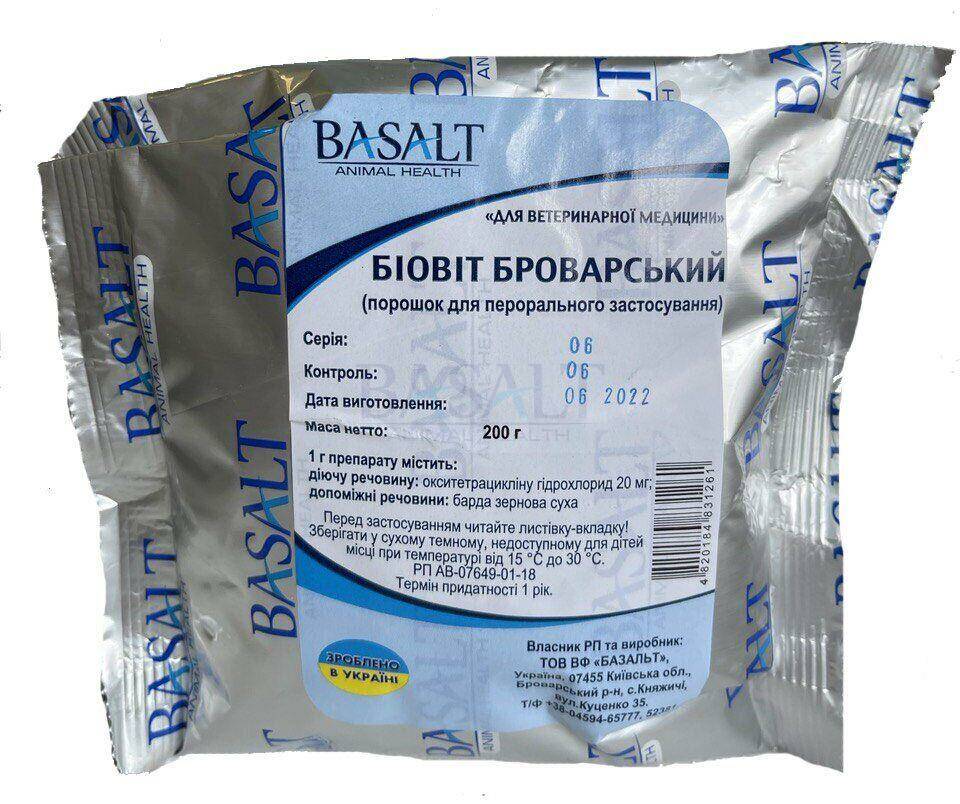 Фармакологiчнi властивостi: Біовіт Броварський – це антибактеріально-вітамінна кормова добавка, яка завдяки хлортетрацикліну гідрохлориду пригнічує ріст і розвиток грамнегативних і грампозитивних мікроорганізмів, в тому числі Escherichia coli, Salmonella typhosa,, Staphylococcus aureus, Streptococcus pyogenes, Bacillus subtilis, Haemophilus influenza, Klebsiella pneumoniae, та пригнічує ріст Enterobacter aerogenes, Pseudomonas aeruginosa тощо; неефективна проти протея, синєгнійної палички, а також проти грибів та вірусів. Хлортетрациклін виводиться з організму протягом доби переважно з сечею та калом. Біовіт має профілактичну, стимулюючу та лікувальну дію, в малих дозах позитивно впливає на обмінні процеси в організмі тварин та птиці, стимулює фагоцитоз, посилює газообмін у легенях, в стимулюючих дозах – підвищує стійкість до захворювань травного каналу, сприяє збільшенню приросту маси, зниженню падежу, прискоренню росту та підвищенню продуктивності тварин та птиці.
