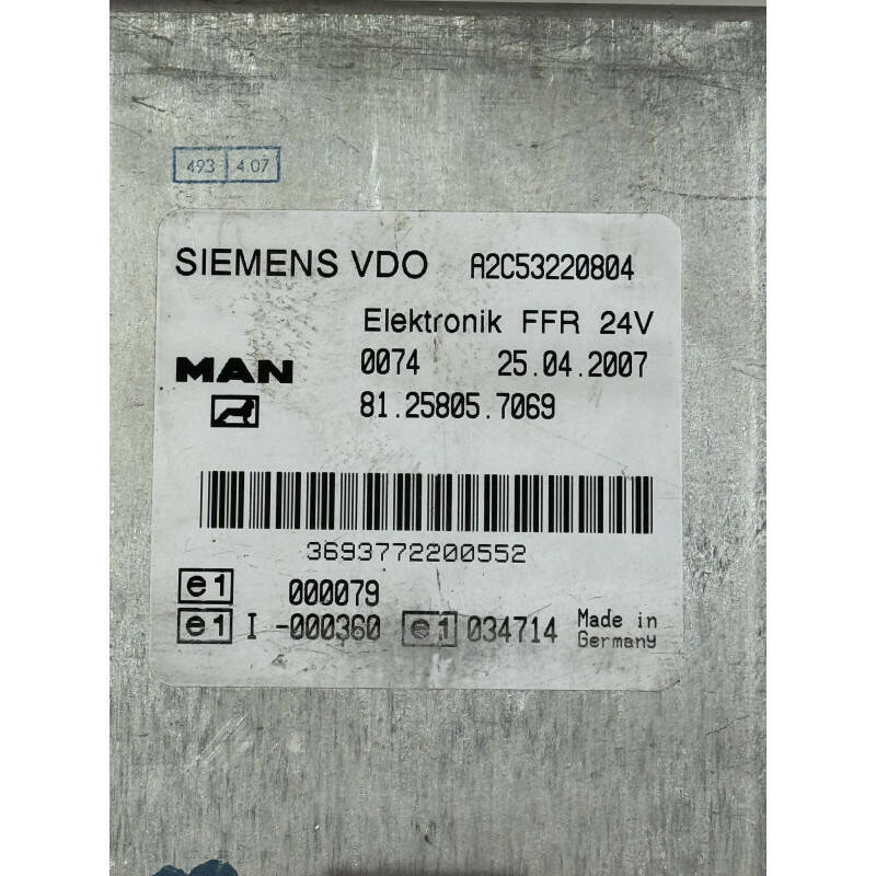 Блок керування MAN, SIEMENS VDO A2C53220804 Elektronik FFR, 81.25805.7069, 24V - це важлива складова електронної системи управління транспортним засобом MAN. Він призначений для забезпечення ефективного керування різними функціями автомобіля і працює при напрузі 24V.