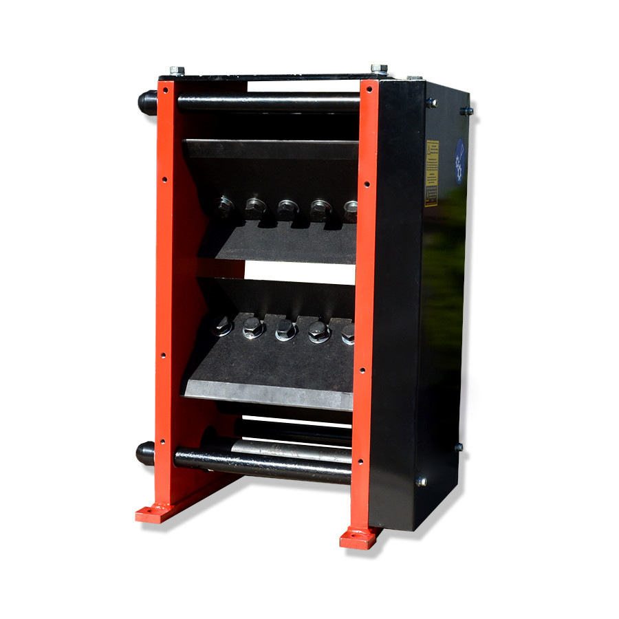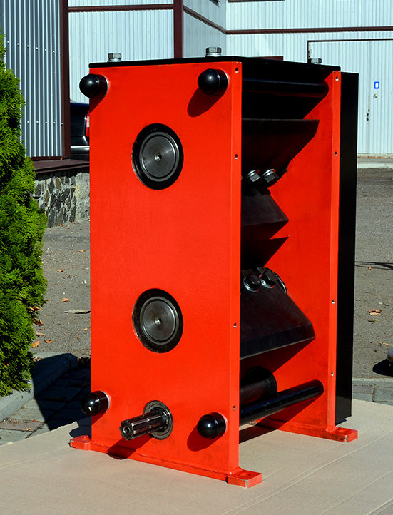 Режущие валы - квадратные, шестерни на валы посажены на шлицах. (Шестерни: диаметр 310мм, толщина 40мм). Ножи изготовлены с рессорной стали марки 65Г с последующей термообработкой и имеют двойной угол заточки, что позволяет продлить срок службы ножей. Толщина ножей 16мм.