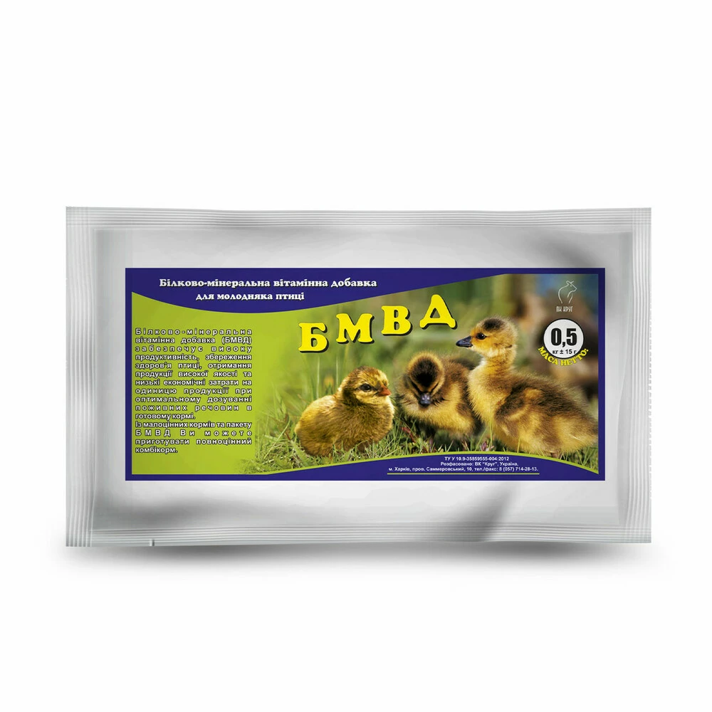 Білково-мінеральна вітамінна добавка (БМВД) для молодняка с/г птиці містить у собі білкові компоненти (шрот соєвий, гарбузовий, дріжджі кормові, шрот соняшниковий, рибне борошно, премікс), а також всі необхідні вітаміни та макро - і мікроелементи. БМВД забезпечує високу продуктивність, збереження здоров'я молодняку сільськогосподарських птахів, отримання продукції високої якості та низькі економічні витрати на одиницю продукції при оптимальному дозуванні поживних речовин в готовому кормі.