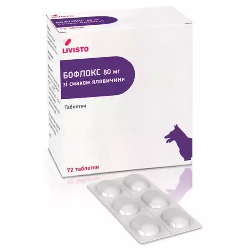 • Опис Таблетки бежевого кольору, з коричневими вкрапленнями та насічками для поділу. Склад: 1 таблетка Бофлокс 20 мг (280 мг) містить діючу речовину: марбофлоксацин - 20 мг. 1 таблетка Бофлокс 80 мг (1120 мг) містить діючу речовину: марбофлоксацин - 80 мг. Допоміжні речовини: лактози моногідрат, целалактоза 80, повідон К 90, кросповідон, кремнію діоксин колоїдний безводний, кальцію бегенат, сухі дріжджі, ароматизатор м’яса. Фармакологічні властивості АТС vet класифікаційний код QJ01 - антибактеріальні ветеринарні препарати для системного застосування. QJ01MA93 - Марбофлоксацин. Марбофлоксацин - синтетичний хіміотерапевтичний засіб, що належить до групи фторхінолонів. Препарат інгібує активність ензиму ДНК-гірази, внаслідок чого порушується реплікація ДНК і синтез клітинного білка бактерій. Марбофлоксацин володіє бактерицидною дією проти грампозитивних і грамнегативних мікроорганізмів (Staphylococcus spp., Escherichia coli, Salmonella typhimurium, Citrobacter freundii, Enterobacter cloacae, Serratia marcescens, Morganella morganii, Proteus spp, Klebsiella spp., Shigella spp., Pasteurella spp., Haemophilus spp., Moraxella spp., Pseudomonas spp.), а також проти мікоплазм (Mycoplasma bovis, Mycoplasma hyopneumoniae). Марбофлоксацин не активний проти анаеробів, грибів, або дріжджів. Після перорального застосування собакам у рекомендованій дозі 2 мг/кг, марбофлоксацин швидко всмоктується і досягає максимальної концентрації в плазмі крові 1,5 мкг/мл протягом 2 годин. Його біодоступність близька до 100%. Марбофлоксацин слабо зв’язується з білками плазми (менше 10%), добре розподіляється по організму і в більшості тканин (печінка, нирки, шкіра, легені, сечовий міхур, травному каналі), досягає вищої концентрації, ніж у плазмі. Марбофлоксацин повільно виводиться (t½ß = 14 годин у собак), в основному, в активній формі з сечею (2/3) і фекаліями (1/3). Застосування Лікування собак та котів при захворюваннях органів сечовивідних шляхів та дихання, шкіри та м’яких тканин (піодермія шкірних складок, імпетиго, фолікуліт, фурункульоз, бактеріальний целюліт), що спричинені мікроорганізмами, чутливими до марбофлоксацину. Показання Інфекції шкіри та м’яких тканин. Викликані Staphylococcus spp. (S. aureus і S. intermedius), E. coli, Pasteurella multocida і Pseudomonas aeruginosa. Собаки: Піодермія шкіри, імпетиго, фолікуліт, фурункульоз, бактеріальний целюліт. Тривалість лікування не менше 5 днів і до 40 днів. Коти: Рани, абсцеси, флегмони. Тривалість лікування 3-5 днів. Інфекції дихальних шляхів. Викликані Pasteurella multocida, Enterobacteriaceae (E. coli, Klebsiella pneumoniae), стафілокок spp. (S. aureus, S. intermedius), Pseudomonas aeruginosa, Bordetella bronchiseptica і Streptococcus spp. Собаки: Тривалість лікування не менше 7 днів і до 21 дня. Коти: Інфекції верхніх дихальних шляхів. Тривалість лікування 5 днів. Інфекції сечовивідних шляхів. Викликані Staphylococcus spp. (S. aureus і S. intermedius), Streptococcus spp, Enterobacteriaceae (Е. coli, Proteus spp., Klebsiella spp., Citrobacter freundii, Enterobacter cloacae) і Pseudomonas aeruginosa. Собаки: Пов'язані, та не пов'язані з простатитом або епідидиміт. Тривалість лікування не менше 10 днів і до 28 днів. Дозування Перорально. Рекомендована доза становить 2 мг марбофлоксацину на 1 кг маси тіла на добу. Для правильного визначення дози необхідно точно визначити масу тіла тварини (наскільки це можливо), щоб уникнути недостатньої дози. Курс лікування становить: при лікуванні захворювань шкіри та м’яких тканин – 5-40 діб, залежно від перебігу захворювання; при лікуванні захворювань органів сечовивідних шляхів – 10-28 діб, залежно від перебігу захворювання;
