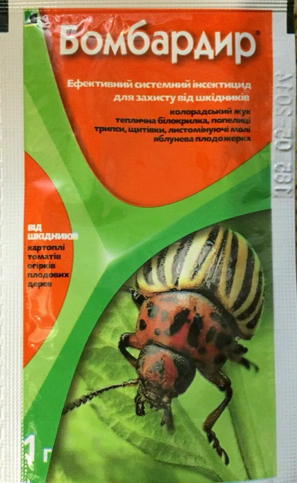 «Бомбардир» - системный инсектицид контактно-кишечного действия, предназначен для защиты посадок картофеля, томатов, баклажанов, огурцов от колорадского жука. Действует на взрослых насекомых и личинок на всех стадиях развития. На яблонях и грушах, хорошо контролирует таких вредителей, как трипсы, щитовки, клопы, тли, белокрылки, листоеды, минеры, плодожорки, сранчовые и др.
