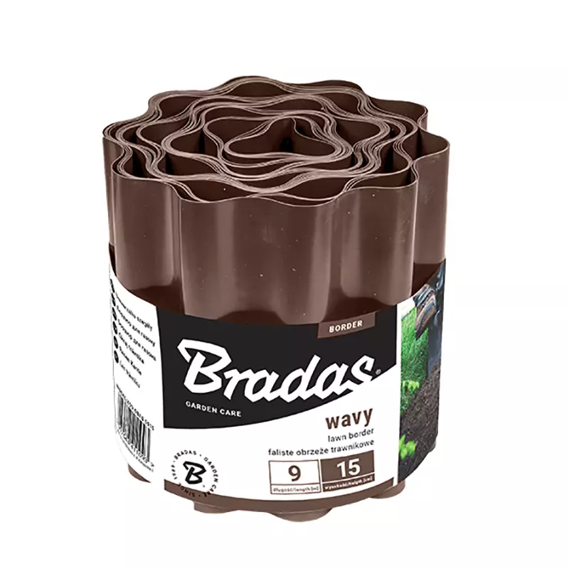 Бордюр хвилястий - це еластична і міцна стрічка висотою 20 см, коричневого кольору. Виготовлена із водотривкого, морозостійкого пластика, що витримує різні погодні умови і дозволяє запобігти переростанню трави, відмінно відокремлюючи газон від квіткових грядок, зміцнює краї садових доріжок і перешкоджає розсіюванню кори та декоративних каменів.