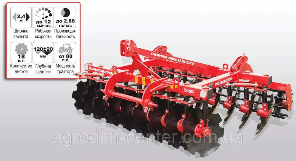 PALLADA - борони дискові призначені для ресурсозберігаючої передпосівної обробки ґрунту під посів зернових, технічних і кормових культур, знищення бур'бур'янів і подрібнення пожнивних залишків після прибирання посівних культур, а також подрібнення, вирівнювання й ущільнення ґрунту після дискування. Борони дискові PALLADA призначені для використання в ґрунтово-кліматичних умовах з вологістю ґрунту до 27 %, а також на полях з великою кількістю пожнивних залишків. Кожен диск борони PALLADA встановлений на індивідуальній стійці, що дозволяє бороні працювати на полях із великою кількістю рослинних залишків і бур'бур'янів, виключаючи намотування рослинних залишків на вісь диск і забивання міждискового простору, а також забезпечує високу ремонтопридатність агрегату. Ресурс роботи дисків збільшений на 100 % за рахунок використання сучасних технологій обробки сталей із вмістом бору та оптимального кута заточування.