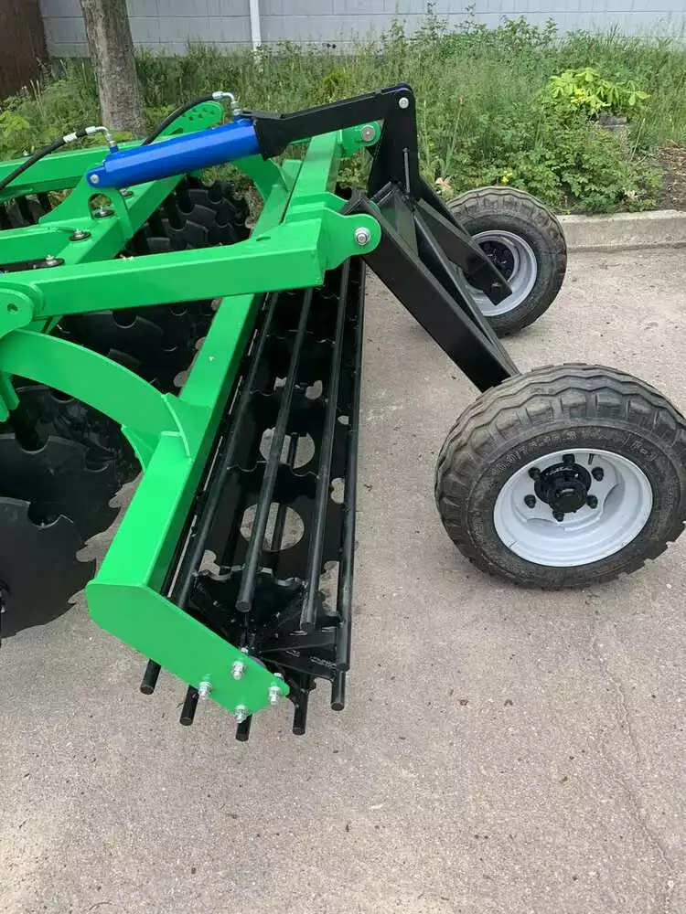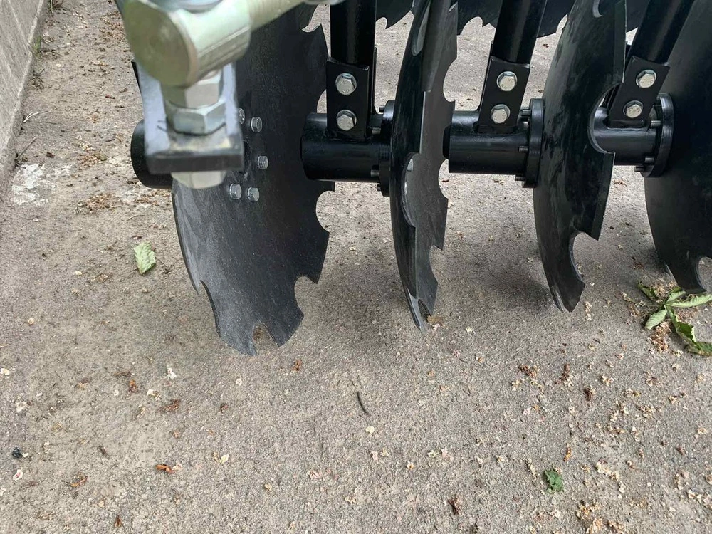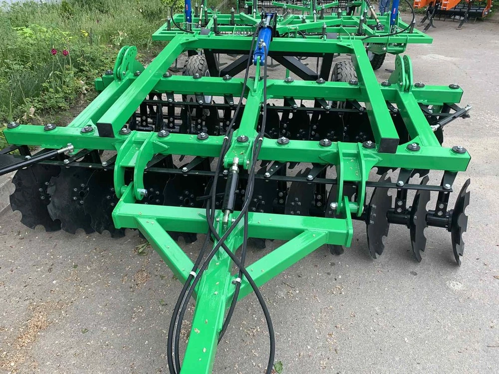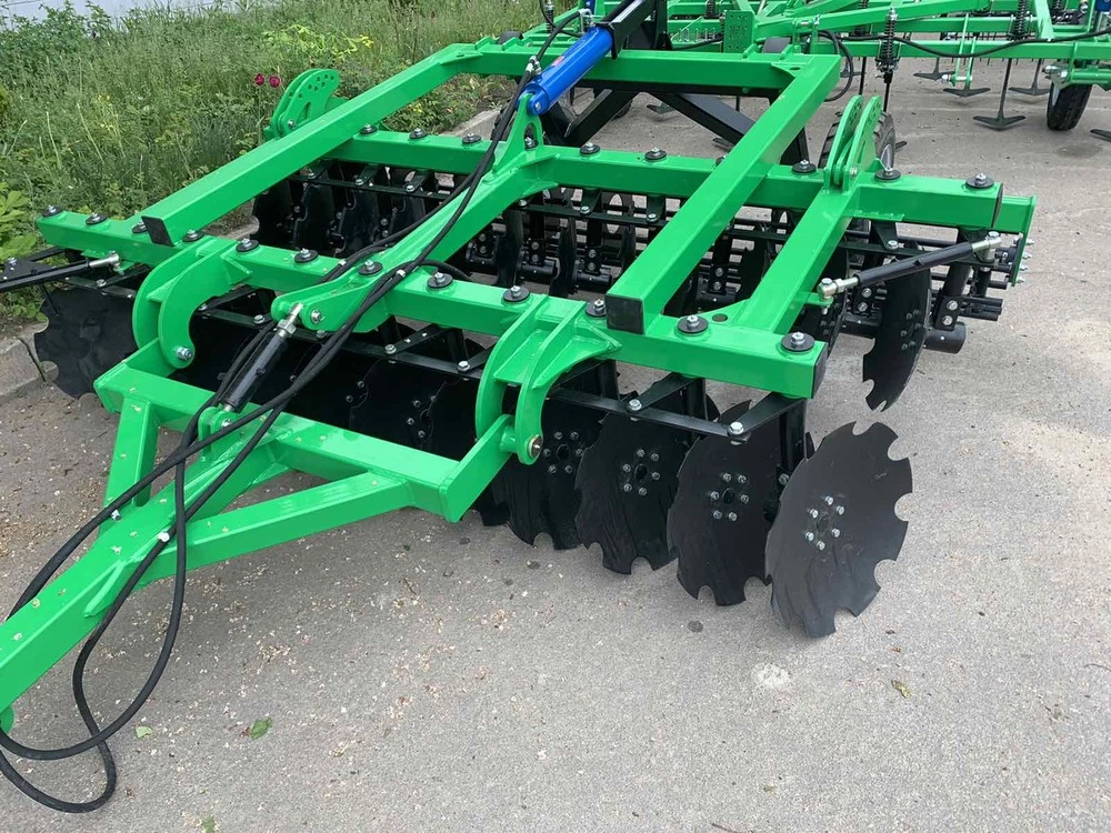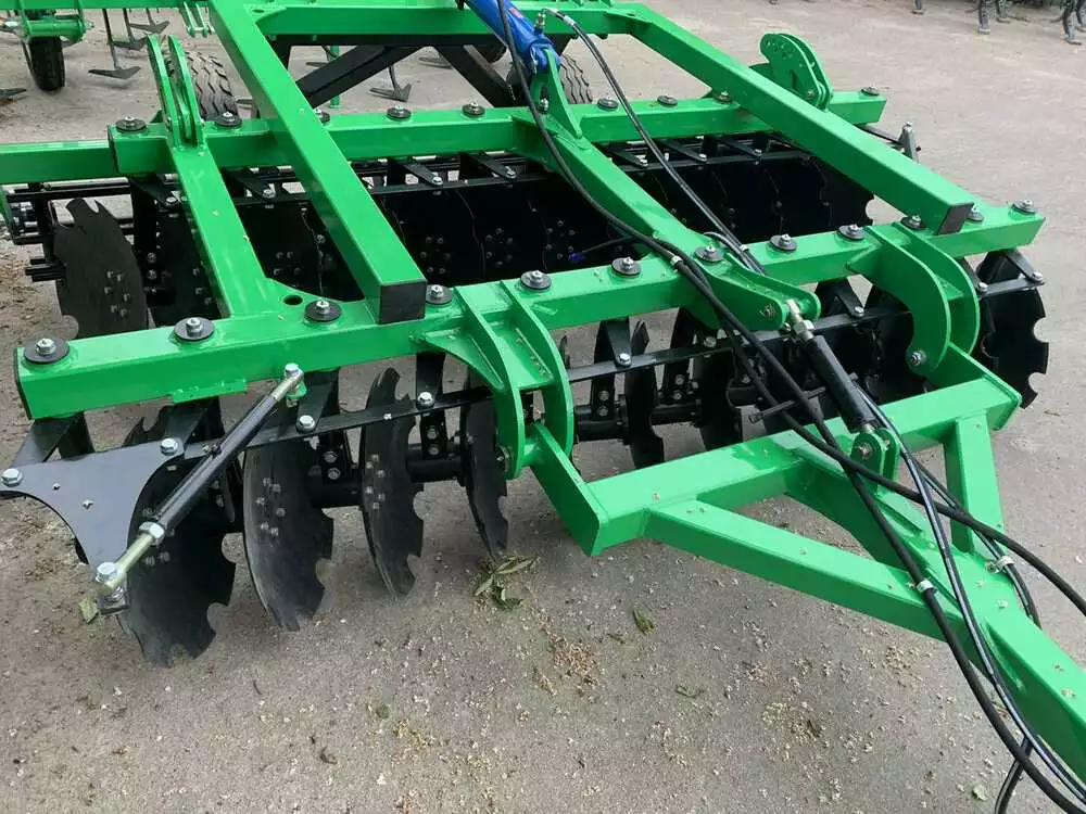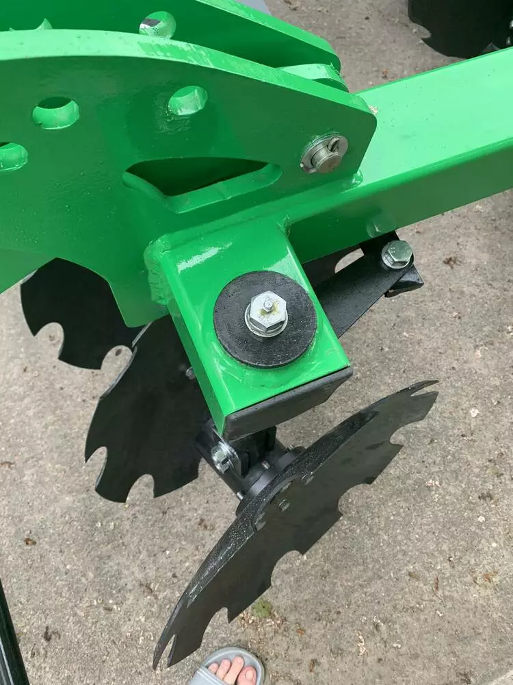 • Кожен диск встановлений на індивідуальній стійці і має нахил відносно вертикальної осі, що дозволяє регулювати кут атаки і робочу ширину захоплення диска.