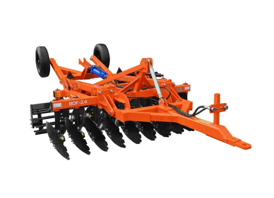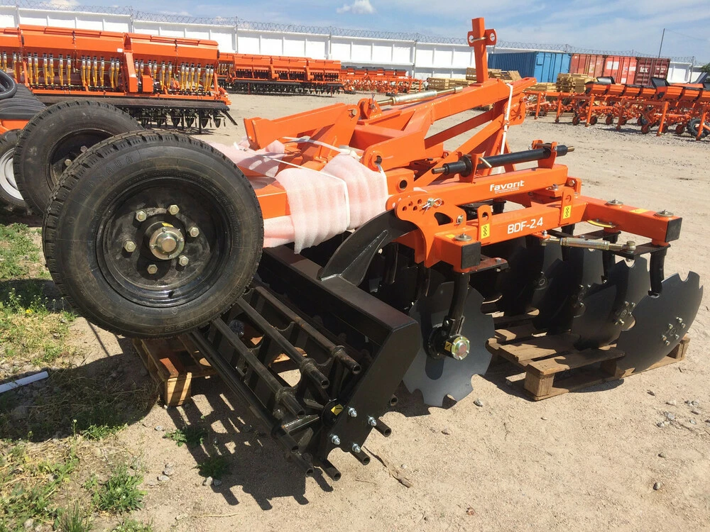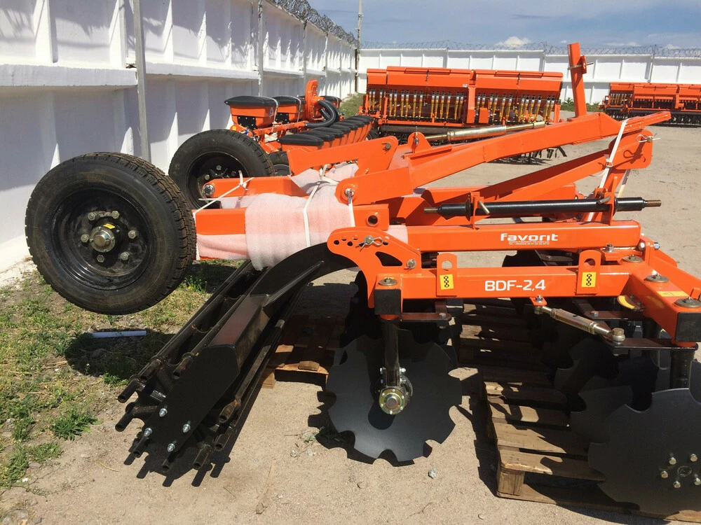 Борона дискова БДФ-2,4 - призначена для передпосівної обробки ґрунту під посів зернових, технічних та кормових культур, знищення бур'янів та подрібнення пожнивних залишків після збирання посівних культур, а також вирівнювання ущільнення грунту після дискування.