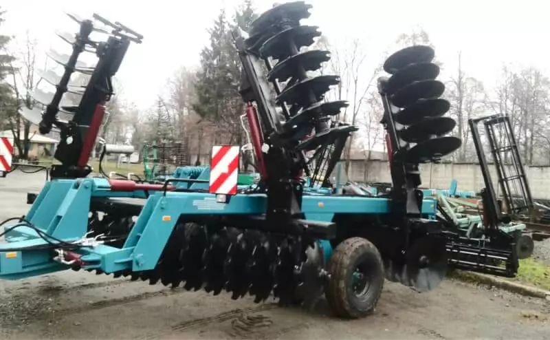Робочі органи – диски борін виготовляються з австрійської бормісткої сталі, що підвищує їх зносостійкість в 1,5-2 рази. Для збільшення зносостійкості вузлів відкидних секцій і забезпечення стабільної глибини обробітку грунту по всій ширині захоплення агрегату: – удосконалено конструкція вузлів відкидних секцій; – встановлені гидрозамки на гідроциліндри відкриття і закриття закрилків. Стабільність роботи передніх і задніх дисків борони забезпечується демпферним пружинним блоком нової конструкції. Вирівнювання сили опору борони і прикладеної сили тяги трактора забезпечується гідроциліндром з гідрозамками, встановленим на дишлі борони.