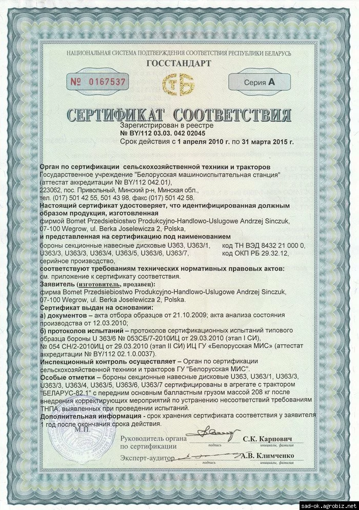 Бороны тракторные дисковые Bomet 2,7 м. 2 секции Бороны тракторные дисковые Bomet 2,7 м. 2 секции – это агрегация, которая используется с большими тракторами мощность, которых не ниже 73 лошадиных сил. Основная задача для, которой используют данные бороны, это обработка земляной почвы механическим методом, при помощи режущих дисков и катка. Суть работы в том, что диски подогнуты, что дает им угол атаки, под которым они режут почву и соответственно – рыхлят ее, далее идет каток, который измельчает глыбы и ровняет площадь. Аналогичные модели: . В нашей группе «Бороны на трактор», вы сможете осмотреть все модели борон, которые мы реализовываем и почитать интересную информацию о них. Купить бороны тракторные дисковые Bomet 2,7 м. 2 секции, значит приобрести оборудование, качество которого гарантируется одним из изготовителей Польши компанией Bomet.