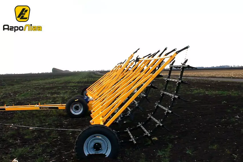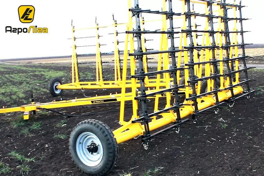 Борона гидравлическая шлейфовая БГШ состоит из следующих узлов: центральная рама с прицепным устройством к трактору; подъемными (в транспортном положении) крыльями, соединенными с центральной рамой крестовинами на подшипниках; 7 секций борон; 4-х опорных колес с шинами атмосферного давления 6,5х16; гидросистемы, состоящие из 2-х гидроцилиндров, рукавов высокого давления (РВД) с разрывными муфтами. Борона может эксплуатироваться во всех почвенно-климатических зонах, кроме районов с значительными каменистыми включениями. Влажность почвы не должна превышать 27%, а твердость почвы до 3,5 МПа. Борона агрегатируется с тракторами мощностью от 130 л.с., оснащенными гидрофицированная прицепной системой. Борона гидравлическая зубовая шлейфовая (БГШ 12) – прицепная складывающаяся борона, которая предназначена для выполнения следующих работ: Подготовка пашни к посевным работам и обработка паров; Весеннее закрытие влаги на полях; Вычесывание сорняков на нитевидной стадии развития; Заделка минеральных удобрений, после внесения их в почву; Довсходовое и послевсходовое боронование посевов;Уничтожение всходов бурьяна Выравнивание полей и рыхление грунта для разрушения капилляров после основной обработки Преимущества агрегата – борона шлейфовая БГШ Особая конструкция (шарнирная) рамы шлейфовой секции позволяет копировать рельеф поля. Ширина захвата от 12 м для использования с различными тракторами; Несущая рама выполнена из стального бруса 200х200х8 мм (200х200х10мм) обеспечивает длительный срок службы; Длина секции шлейфовой бороны 2,5 м позволяет качественно измельчать и распределять измельченные пожнивные остатки; Малая чувствительность по сравнению с дисковыми боронами к влажности почвы; Перевод бороны из транспортного в рабочее положение за 3 – 5 мин одним работником. Металлоконструкции изготавливается полуавтоматической сваркой в среде защитных газов из низкоуглеродистых сталей. Навеска борон осуществляется на центральную раму и крылья за счет поводков.  Рабочий орган – зуб ромбовидной формы из стали 65Г, который благодаря форме значительно уменьшает тяговое сопротивление бороны, что ведет к увеличению производительность и снижению затрат на обработку 1 Га земли; При покраске сеялок используется высокотехнологичное оборудование и краски итальянского производителя Roberlo, которые гарантированно защищают металл более 10 лет, что соответствует сертификатам качества ISO. С помощью окрасочного оборудования welcome мы можем сохранять постоянное качество покраски и толщину лакокрасочного слоя гарантирует эстетичный вид.   Центральная рама соединена крестовинами на подшипниках