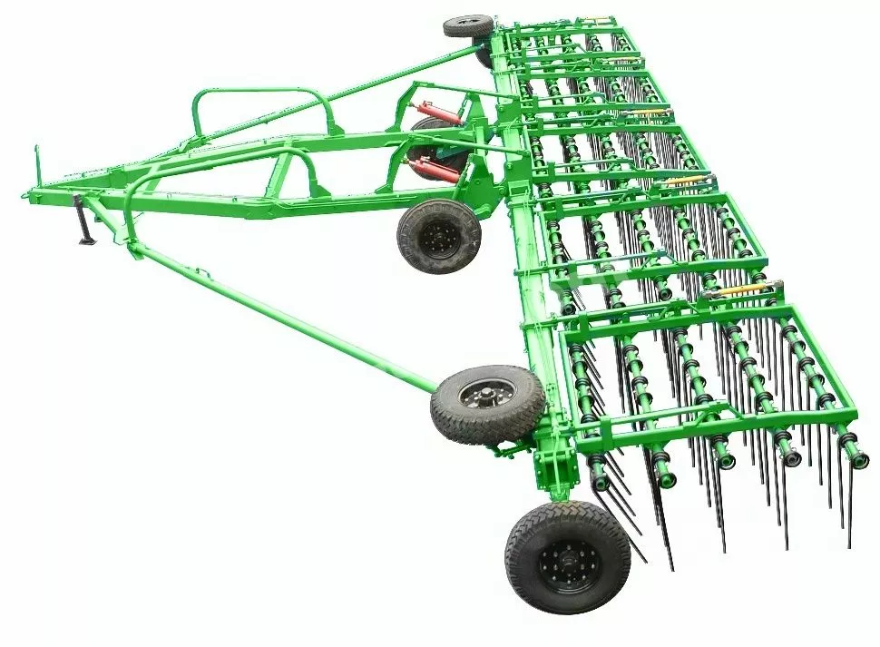 Борона пружинная имеет большая длину пружинных двойных зубов и регуляция угла наклона в переделах от 45 до 80 градусов позволяет проводить возделывание почв разной влажности и твердости с большим количеством послежатвенных остатков. Составление и разложение бороны проводится механизатором с помощью гидросистемы трактора. Положение опорных колес регулируется в вертикальной плоскости, что позволяет компенсировать износ рабочих органов и обеспечивает большой срок их службы. Использование шин низкого давления предотвращает переуплотнение почвы.