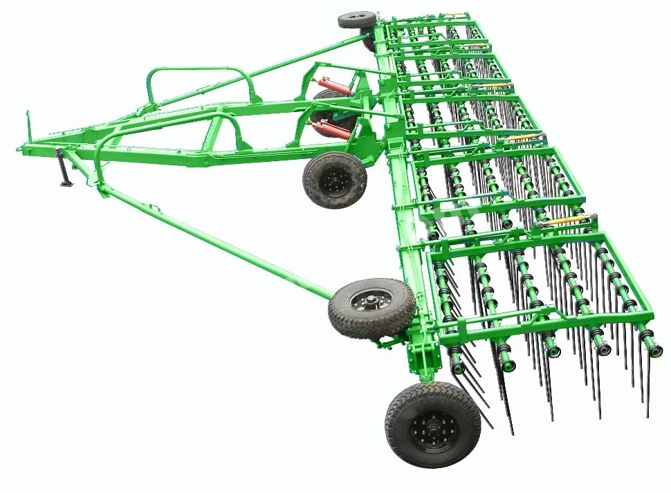 Большая длина пружинных двойных зубцов и регуляция угла наклона в пределах 45 — 80 градусов позволяет возделывание почв разной влажности и твердости с большим количеством послежатвенных остатков. Положение опорных колес регулируется в вертикальной плоскости, что позволяет компенсировать износ рабочих органов и обеспечивает большой срок их службы.