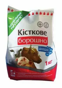 Кормова добавка КІСТКОВЕ БОРОШНО ( обезжирений кістковий преципітат ) ТУ 15.1- 0539-2005 Склад: кальцій - 35 %, фосфор - 16 %, натрій, магній, калій, хлор, фтор, залізо, цинк, мідь, марганець, кобальт. Застосовують для поліпшення обміну речовин, покращення апетиту, відновлення та підтримки співвідношення Са та Р в організмі, повноцінного росту молодих тварин, запобігання рахіту, підвищення продуктивності, покращення структури та міцності шкарлупи яєць. Норми вводу в корми: ВРХ - 50-100 г/гол., свині - 20-30 г/гол., собаки та коти - 5 г/10 кг., птиця - 5-15 % до корму. Зберігати в добре провітрюваному приміщенні при температурі не вище 25 С. Термін придатності - 12 місяців.