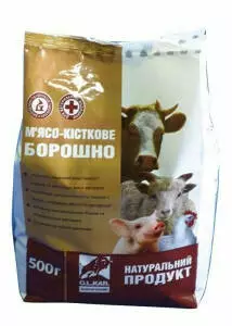Кормова добавка з ВИСОКОЯКІСНОЇ СИРОВИНИ М'ЯСОКІСТКОВЕ БОРОШНО ( для твариництва та кормовиробництва ) ТУ 15.1- 05395747002-2003 Склад: кальцій - 35 %, фосфор - 16 %, натрій, магній, калій, хлор, фтор, залізо, цинк, мідь, марганець, кобальт. Вміст протеїну 47,8%, вологи 11,4%, золи 22%, жиру 14,2%, клітковини 4,1% Застосовують для поліпшення обміну речовин, покращення апетиту, відновлення та підтримки співвідношення Са та Р в організмі, повноцінного росту молодих тварин, запобігання рахіту, підвищення продуктивності, покращення структури та міцності шкарлупи яєць. Норми вводу в корми: ВРХ - 50-100 г/гол., свині - 20-30 г/гол., собаки та коти - 5 г/10 кг., птиця - 5-15 % до корму. Зберігати в добре провітрюваному приміщенні при температурі не вище 25 С. Термін придатності - 6 місяців. Виробник: ТОВ "Фарбалюкс" Україна
