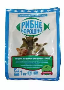 Кормова добавка БОРОШНО РИБНЕ Дозування: змішувати з сухим або вологим кормом (г/добу на голову): поросята до 30 кг - 120; свині 30-70 кг - 200; свині вагою 70 кг і більше 300; кури-несучки, бройлери, качки, гуси, індики - 3. Зберігання: сухе, чисте, добре вентильоване приміщення при t не вище 30 С та відносній вологості повітря не вище 75 %. Термін придатності: 6 місяців.