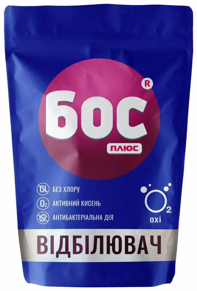 БОС плюс OXI Відбілювач кисневий для білих тканин (відбілювач) 200г. Порошок для ефективного відбілювання і виведення складних плям, активний кисень не пошкоджує структуру волокон тканини, усуває сірий та жовтий наліт. Ефективний вже при + 30 ° C (при підвищенні температури дія засобу посилюється). Відбілювач БОС плюс можливий у використанні в якості як окремого засобу для відбілювання чистих речей, для замочування перед пранням або під час прання разом з основним засобом. Чинить антибактеріальну дію. Не містить Хлору.