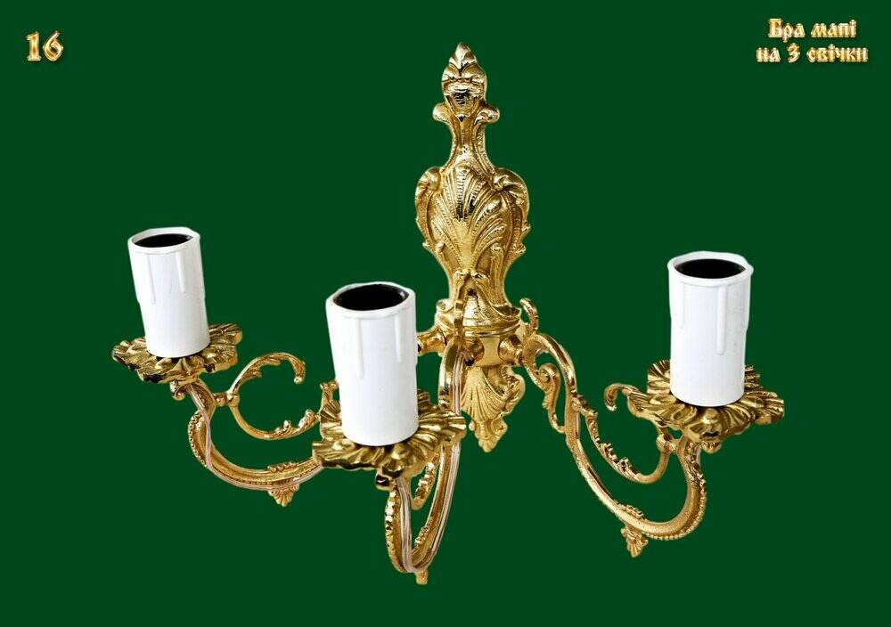 Бра настінна мала, триріжкова ручної роботи, золотистого кольору, на три електричні лампи у вигляді свічок. За бажанням електричні лампочки можна замінити на свічники для свічок будь-якого діаметра.