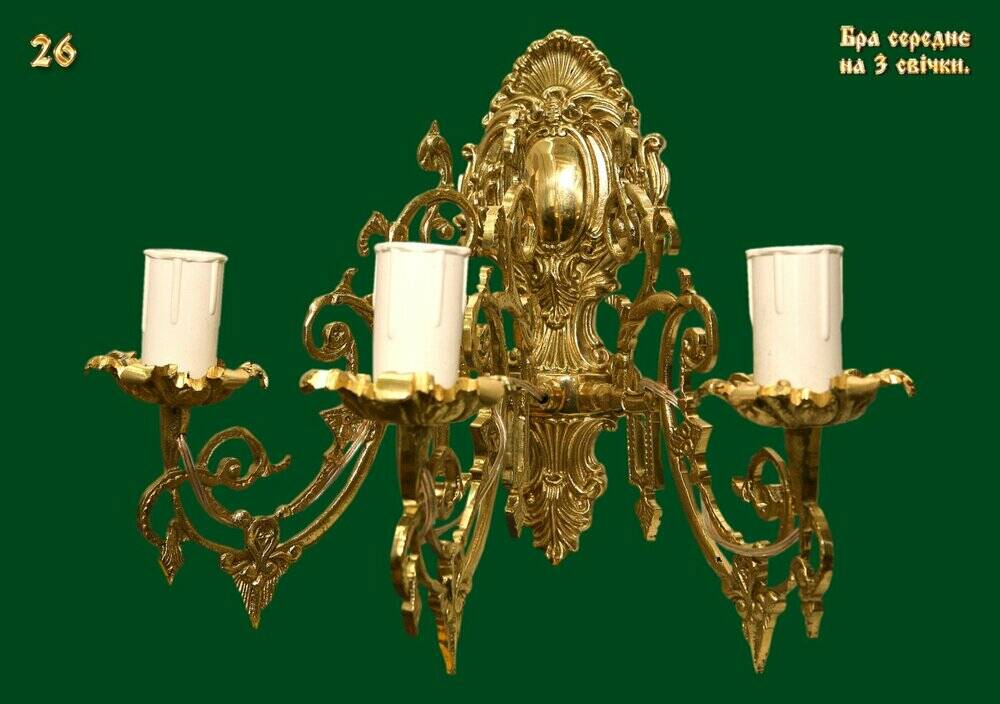 Бра настінна широка, дворіжкова ручної роботи, золотистого кольору, на 2 електричні лампи у вигляді свічок. За бажанням електричні лампочки можна замінити на свічники для свічок будь-якого діаметра. Розмір: 40х32 (Ш х В). Вага, кг: 2,485.