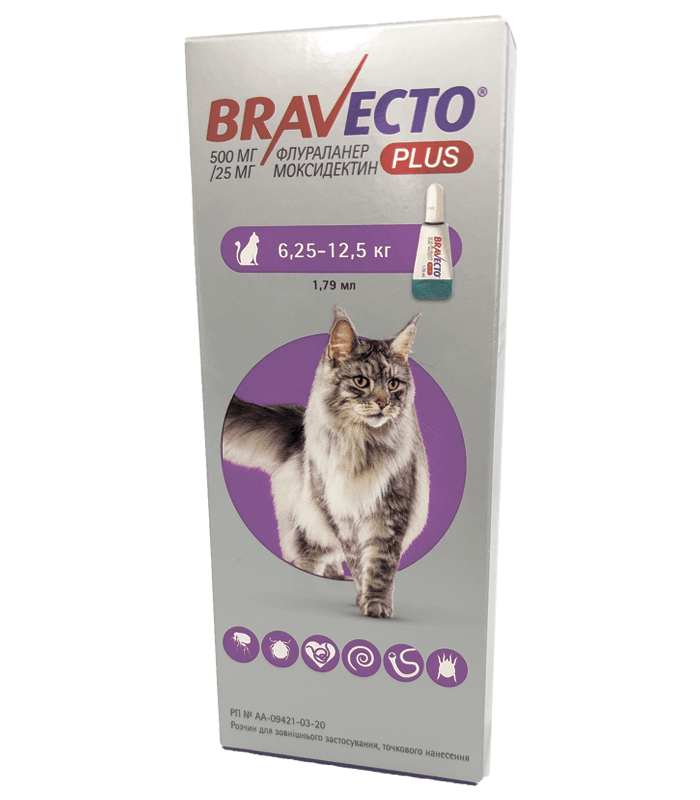 Бравекто ® Плюс – iнсекто-акарицидний препарат системної дії. Мiстить дiючi речовини: флураланер та моксидектин.