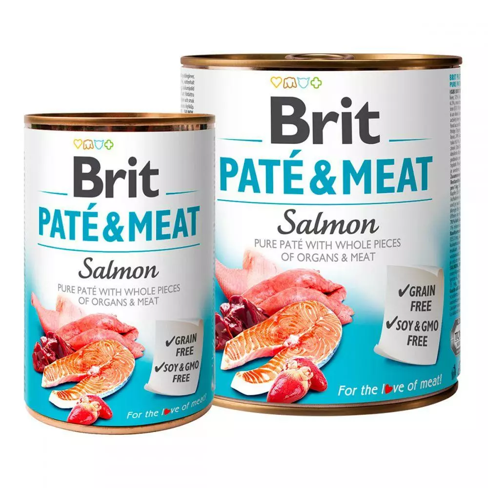 Brit Pete & Meat Salmon Консерви для собак з лососем Справжнє м'ясо з цілими шматками потрошки в паштет Високий вміст якісного м'яса і його м'яка обробка - це гарантія відмінного смаку і аромату. Вишукана комбінація цих м'ясних шматків і потрошки в паштет ідеально задовольнить і чотириногих гурманів Brit Paté & Meat - це ідеальна добавка до гранул. Вона допомагає поліпшити раціон харчування і доповнює рідинами без зернових - без сої гмо Склад: