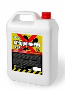 Бродіфакум 0,25% Опис В'язка прозора рідина червоного або синього кольору. Колір засобу визначається наявністю барвника. Склад 100 мл препарату містить діючу речовину (г): бродіфакум 0,25; допоміжні речовини: денатоніум бензоат (бітрекс) - 0,2; барвник харчовий - 0,15; триетиленгліколь до - 100 мл. Фармакологічні властивості Бродіфакум - отрута антикоагулянтної дії нового покоління, яка при потраплянні в організм гризунів порушує утворення вітаміну К1, за участі якого виробляються білки протромбінового комплексу. Поїдаючи отруєну принаду, гризуни отримують смертельну дозу препарату протягом 1-2-х днів. Через добу після вживання летальної дози бродіфакуму рівень згортання крові у гризунів різко сповільнюється, і підвищення проникливості судин викликає загибель організму від кровотечі. Загибель гризунів наступає через 3-7 діб. За параметрами гострої токсичності класифікації токсичності і небезпеки родентицидів Бродіфакум при введенні у шлунок щурів належить до III класу (помірно небезпечні речовини), при нанесенні на шкіру щурів - до IV класу (малонебезпечні речовини). До складу препарату входить також бітрекс (гіркий компонент), що оберігає приманки на основі Бродіфакуму 0,25% від поїдання птахами і знижує небезпеку випадкового отруєння нецільових видів тварин. Застосування Засіб призначений для приготування і застосування професійним контингентом отруєних приманок для знищення щурів і мишей в практиці дератизації на об'єктах різних категорій. Дозування Отруєну приманку готують шляхом змішування засобу Бродіфакум 0,25% з доброякісними харчовими продуктами (очищене зерно, крупа, гранульований комбікорм тощо) в співвідношенні 20 мл концентрату на 1 кг готової принади. Для підвищення привабливості для гризунів рекомендується використовувати додаткові харчові атрактанти - рослинну нерафіновану олію (3%) або цукор (3-10% в складі приманки). Приманку розміщують у попередньо виявлених місцях проживання гризунів: уздовж стін, перегородок, біля нір, розкладаючи в сухих місцях під укриттями з використанням пристосованих ємностей (ящики для принад, дренажні труби, лотки, коробки) або спеціальних контейнерів. Приманку розкладають по 50-100 г для щурів або по 10-25 г для мишей. Відстань між точками розкладки приманки становить 2-15 м, в залежності від чисельності гризунів. Порції приманок для мишей розкладають частіше, ніж для щурів. Розкладену приманку оглядають через 1-2 дні після розкладки, а потім з інтервалом в 1 тиждень. Протипоказання Забороняється використання препарату в місцях зберігання кормів для тварин та продуктів харчування. Застереження При проведенні планової дератизації на території не допускати присутності домашніх тварин, сторонніх осіб, особливо дітей. Розкладати препарат мають право відповідні фахівці або інші особи, які пройшли інструктаж по роботі з даним отрутохімікатом. Всі роботи з препаратом проводити у спецодязі, розкладати приманки із засобом за допомогою гумових рукавичок, пінцетів, пластикових ложок. Не допускати потрапляння препарату на шкіру, слизові оболонки, всередину. У випадку забруднення шкіри препаратом старанно промити це місце водою з милом, при потраплянні препарату в шлунок - звернутися до лікаря. Залишки нез'їденого препарату, тару, трупи гризунів утилізують згідно чинних інструкцій з дератизації. Форма 