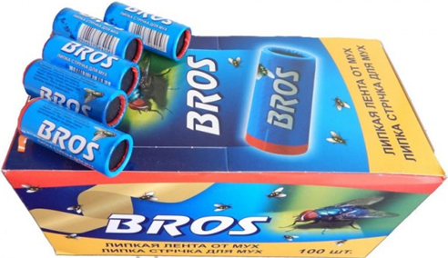 Стрічка від мух Bros - застосовується для боротьби з літаючими комахами (мухи, оси, комарі). Липкі стрічки Bros використовують не тільки в приміщеннях, а також на відкритому повітрі. На паперову стрічку нанесений клей з приманкою від літаючих комах, який володіє властивостей не висихати тривалий час. Клей зберігає свою клейкість протягом 2-х місяців. Має економічна витрата: для приміщення площею 10-15 кв.м достатньо 1-2 стрічок. Не містить токсичних речовин, підходить для алергіків. Проста в застосуванні. Безпечна для навколишнього середовища.