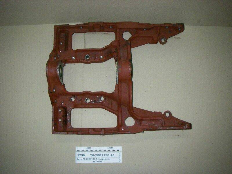 Брус передний устаналивается на тракторах МТЗ-80, 82, 892, 920, 950, 1025 с двигателями стандарта ЕВРО-0, ЕВРО-1, оригинальный, производстава ОАО 'Витебский завод тракторных запчастей', ОАО 'ВЗТЗЧ', г. Витебск, Республика Беларусь Брус полурамы — это литая стальная конструкция, имеющая в плане П-образную форму. В средней части бруса находится поперечина, между ней и верхним основанием бруса также проходят две продольные балки. В нижней части бруса, на его верхнем основании и поперечине, находятся две проушины (или два прилива), с помощью которых устанавливается передний мост. Крепление моста к брусу полурамы производится с помощью шкворня, пропущенного через центр балки моста и проушины, фиксация шкворня осуществляется простым штифтом. Шкворень установлен в проушинах на втулках, которые при чрезмерном износе можно заменить. Благодаря такой конструкции передняя балка полурамы обеспечивает надежное крепление переднего моста, но позволяет ему свободно качаться в поперечной плоскости трактора. Именно поэтому тракторы МТЗ-80/82 хорошо преодолевают неровности дороги, несмотря на то, что передняя подвеска у них зависимая.