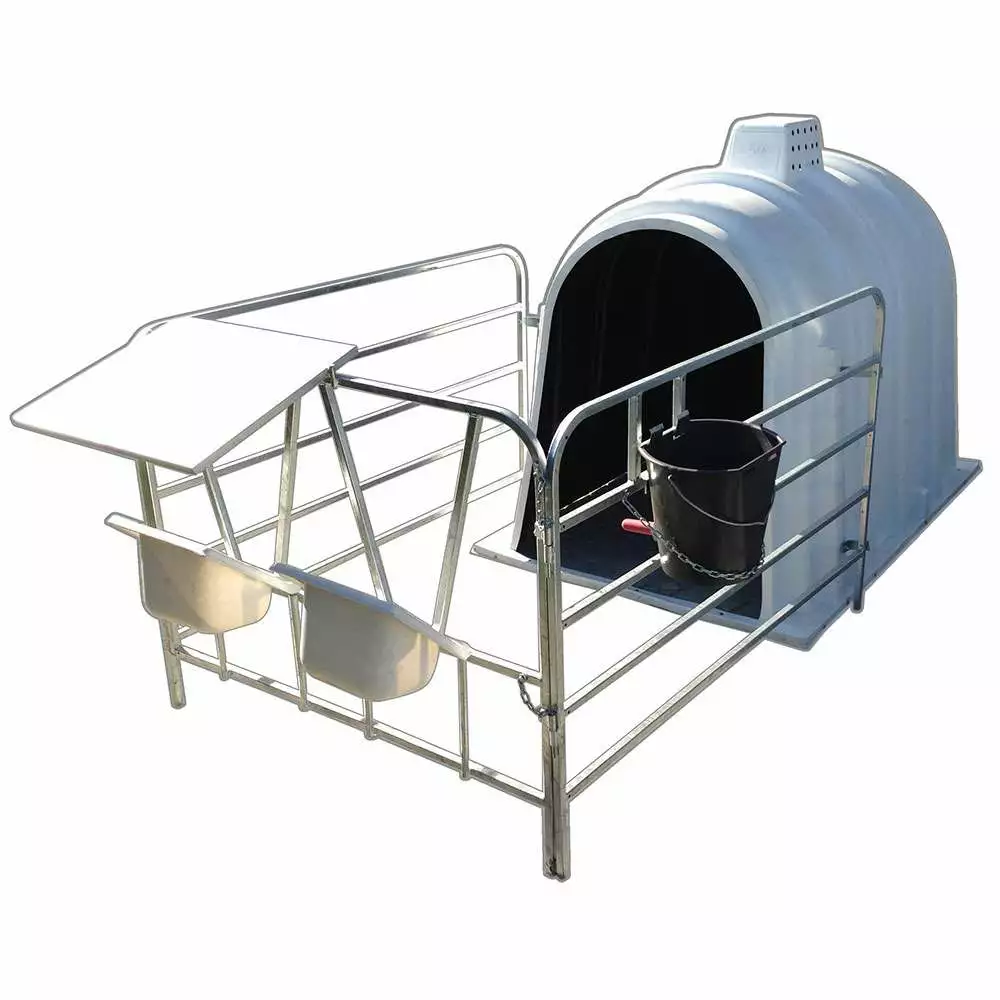 Будиночок для телят дозволяє утримувати тварин з використанням технології холодного утримання. Будиночок виготовлений з поліуретану, який володіє ударостійкими властивостями, стійкі до перепадів температур. В комплект входить вольєр з оцинкованої сталі, годівницею та поїлкою.