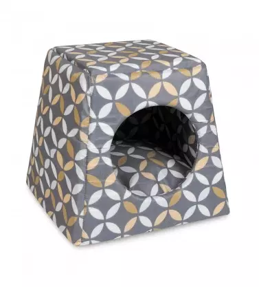 Практичний будиночок з м'якої бавовняної тканини сподобається не тільки котам, а й невеликим собакам. Лежак-трансформер можна використовувати в 2 положеннях: як будиночок з круглим входом і м'якою подушкою всередині; як лежак-диван – потрібно лише натиснути долонею на «дах» будиночка, попередньо вийнявши з нього подушку, а потім покласти її назад до лежака.