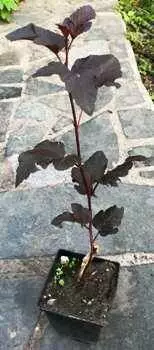 Трилопатевате або п'ятилопатеве листя, що має темно-фіолетовий або пурпурово-червоний відтінок. На сонці колір більш насичений, а в тіні листя стає зеленим із пурпуровим відтінком.