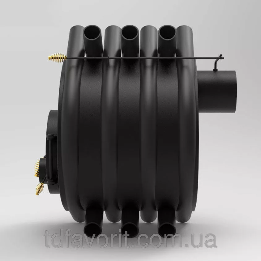 Нагрев воздуха в булерьяне происходит за счет втягивания холодного воздуха через нижнюю часть труб, далее он огибает топочную камеру, нагреваясь до 90 оС, и по тем же трубам выходит вверх. За счет такой конструкции помещение прогревается быстро и равномерно.