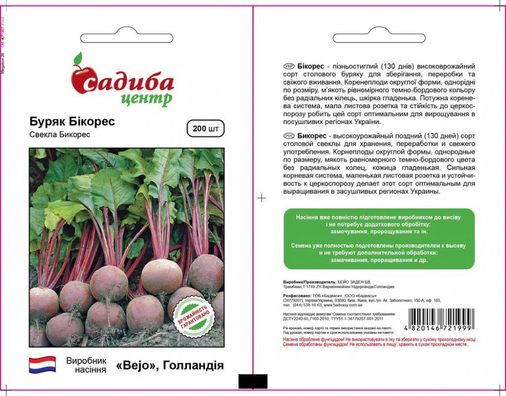Бікорес - пізньостиглий (130 днів) високоврожайний сорт столового буряка для зберігання, переробки і свіжого ринку. Коренеплоди округлої форми, однорідні за розміром, м'якоть рівномірного темно-бордового кольору без радіальних кілець, шкірка гладенька. Потужна коренева система, маленька листова розетка і стійкість до церкоспорозу робить цей сорт оптимальним для вирощування в південних регіонах України.