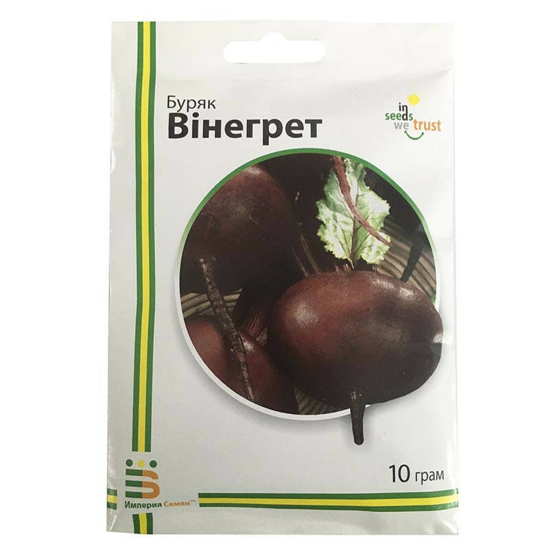 Буряк Вінегрет - столовий ранній сорт. Період від сходів до технічної стиглості 80-115 днів. Коренеплоди правильної округлої форми, масою від 250 до 500 грамів, бордові без білястих кілець. Мають насичений солодкий смак і незамінний для приготування різноманітних салатів, закусок, перших страв, соків. Добре зберігається в зимовий період. Сорт стійкий до перепадів температур і основних захворювань.
