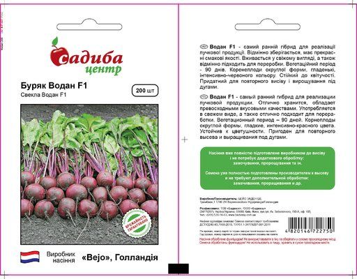 Водан F1 – самий ранньостиглий (85-90 днів) гібрид столового буряка. Переваги гібрида - короткий вегетаційний період і відмінне зберігання - дозволяють вирощувати даний гібрид як повторну культуру після редису, ранньої капусти і ранньої картоплі.  Коренеплоди  округлої форми, однорідні за розміром, м'якоть рівномірного темно-червоного кольору без радіальних кілець, шкірка гладенька. Невеликий листовий апарат і вертикальне розташування листя полегшують збір урожаю. Використовується для здобуття ранньої пучкової продукції. При пізнішому висіві (травень-липень) прекрасно зберігається, не втрачаючи товарного вигляду.